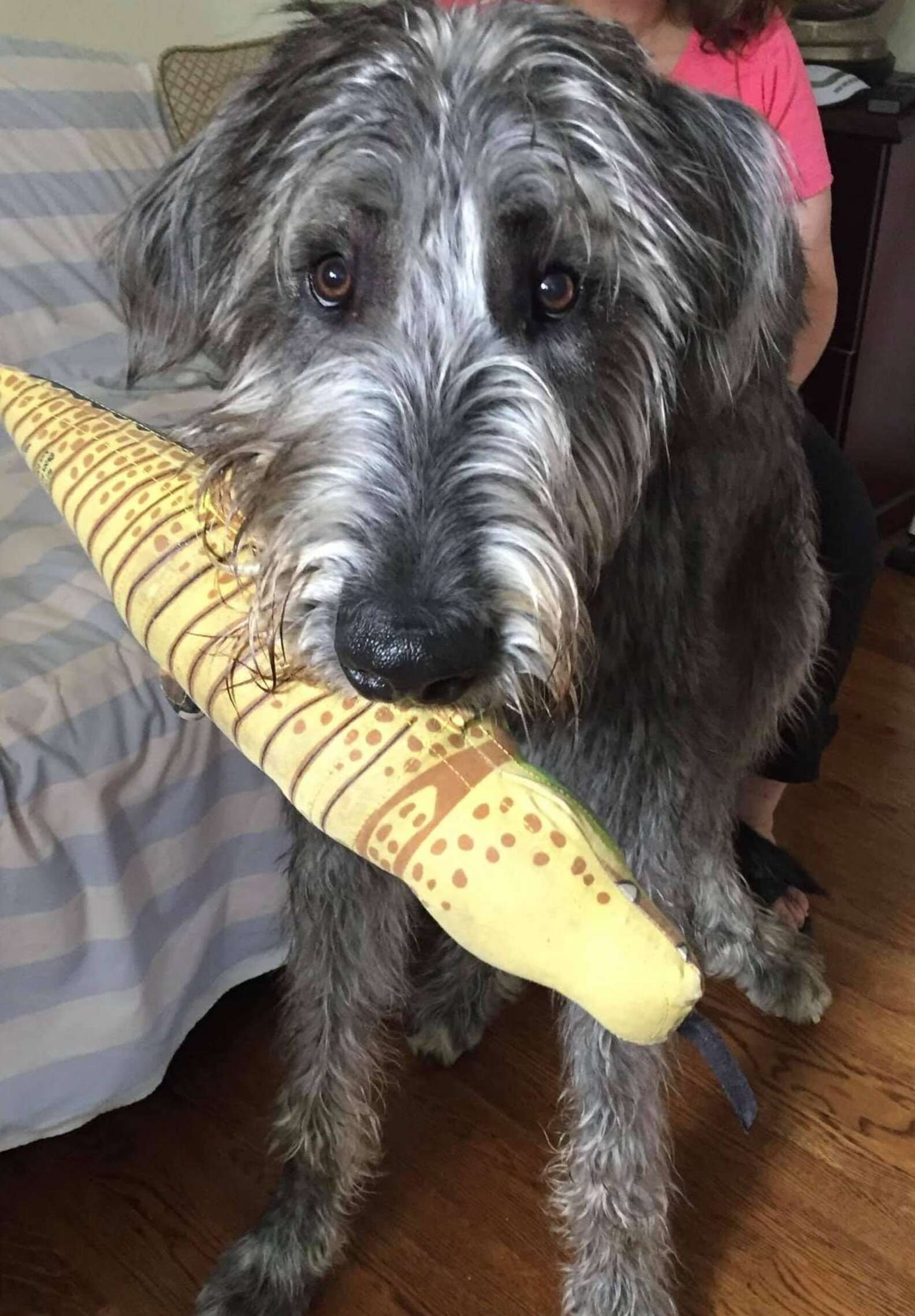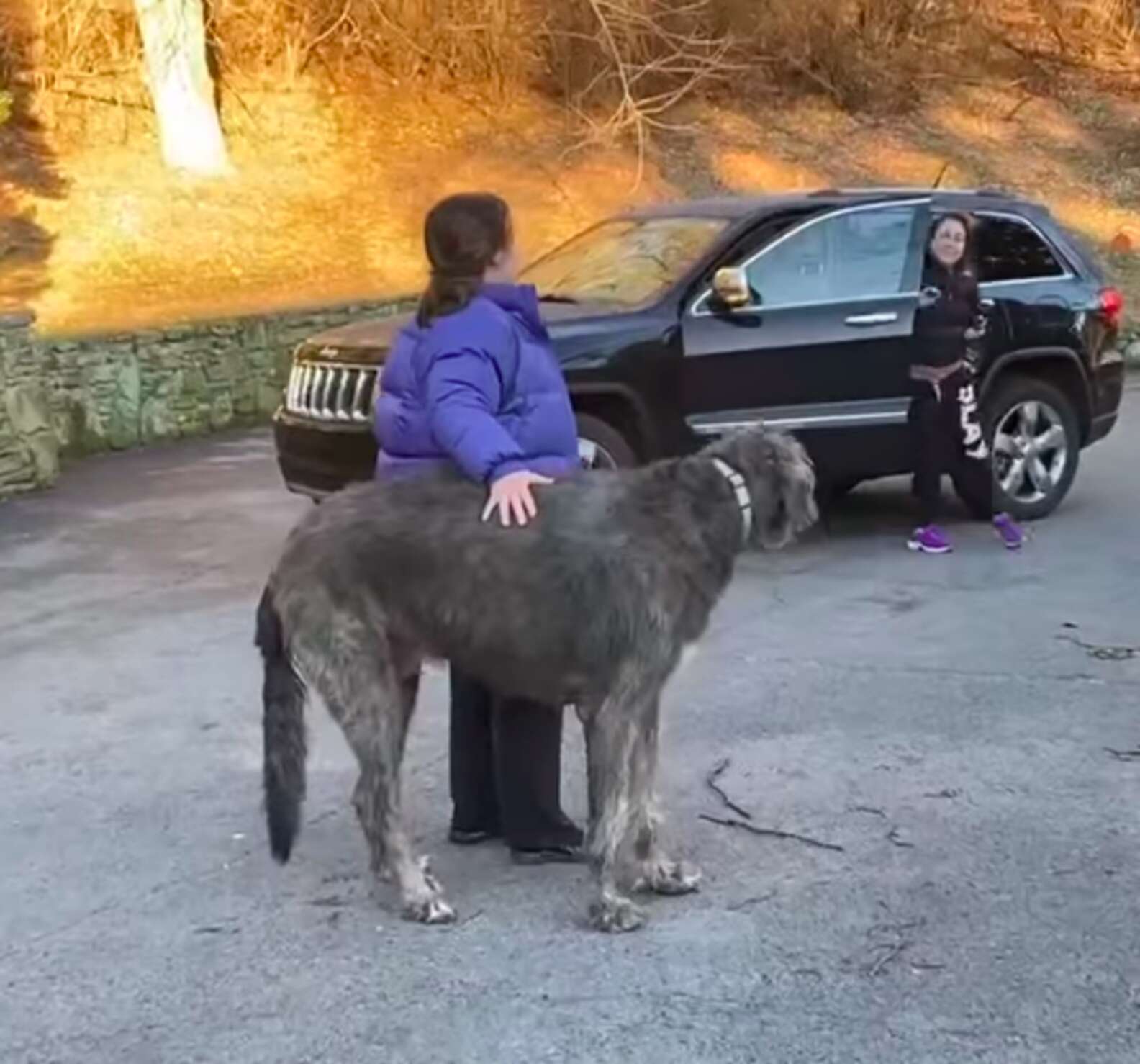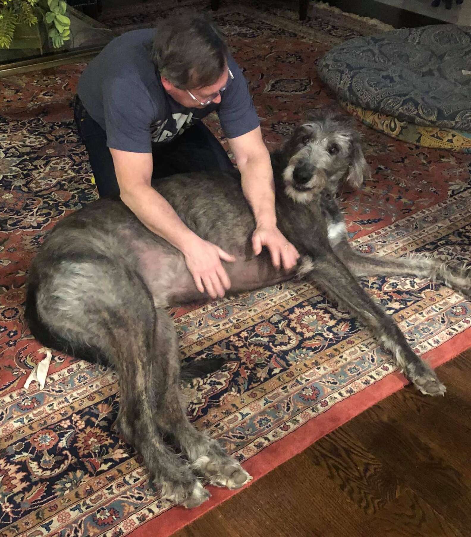 Fergus, a 200-pound Irish wolfhound, was thrown from the backseat as a car ploughed into them at 50 kilometres per hour. The dog stood up, stunned, and began limping away.