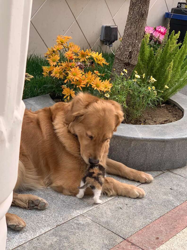 Hearn was shocked when both dogs started comforting the scared little calico. “Tang started whimpering and laid down next to her,” Hearn said. “Cream started licking her and cleaning her.”