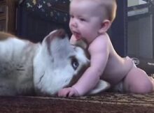 Ever since Troy Slezak’s baby daughter arrived, his one-year-old normally hyper Siberian Husky has calmed right down and plays very gently with her new little human. Dad commented