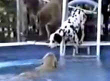 This video is amazing! Beija the Golden Retriever, sensing that her pal isn’t as confident in the water as she is, assists Peanut the Dalmatian into the pool.